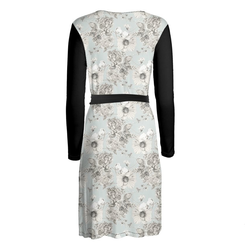 このラップワンピースはエレガントなドレープのある美しいワンピースドレスです。ひざ丈程の長さとなっており、体に美しくフィットするスタイルがお好きな方に最適です。右側の縫い合わせにはベルトループがあり、ベルトを腰に巻き付けることができ、これは内側部分でトップステッチで仕上げられます。ベルト帯は体の前で結ぶスタイルで、胸元のVネックと同じコバステッチが施されています。手首にかけて細くなっている長袖のデザインで、高級感のあるスタイリッシュなワンピースドレスです。